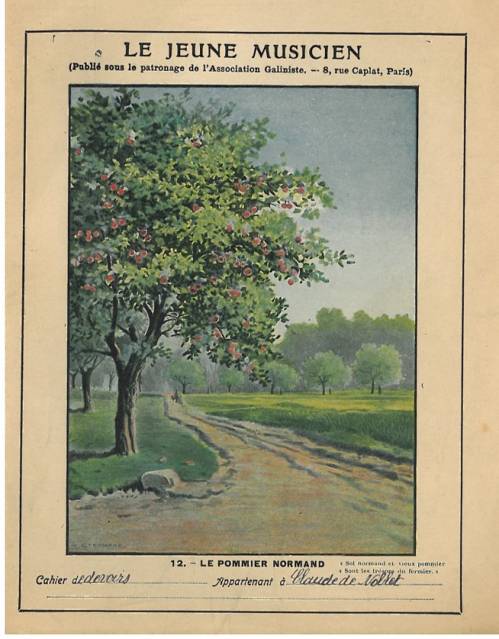 Couverture n° 12 : Le pommier normand (poésie de Gillotin, sur un air normand). Chromolithographie sur papier beige épais. En pages intérieures, trois textes explicatifs : la musique facile (G. Michaelis) ; aperçu de la notation chiffrée ; le galinisme (Dangueuger). Au dos, partition, parle et explication du texte et de la musique.