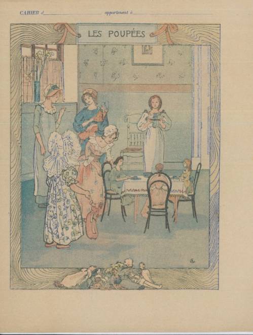 Couverture non numérotée : Les poupées. Chromolithographie sur papier épais beige. Elégante frise style Art déco. Au dos, texte explicatif anonyme.
