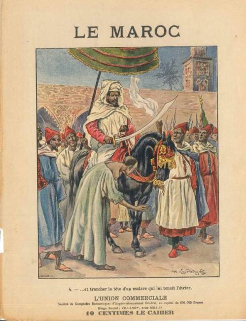 Couverture n° 4 : « … et trancher la tête d’un esclave qui lui tenait l’étrier. » Chromolithographie sur papier épais beige. En pages intérieures et au dos, texte explicatif anonyme.