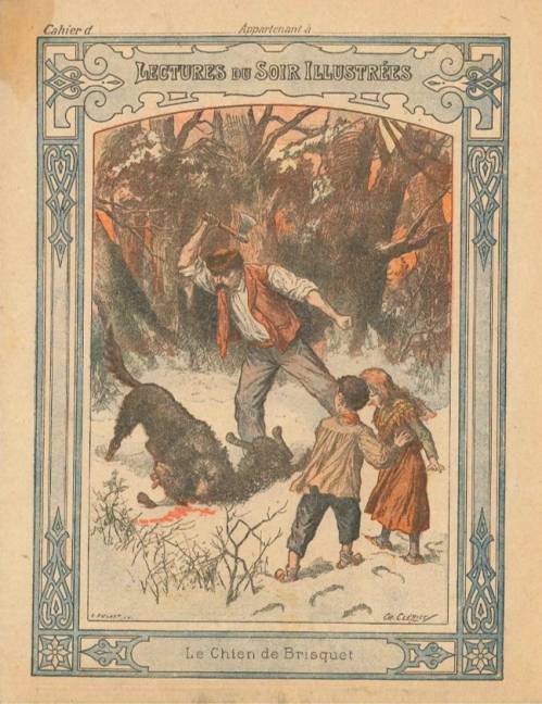 Couverture non numérotée : Le chien de Briquet. Chromolithographie sur papier épais beige. Frise élégante en 1ère et 4ème de couverture. Au dos, texte signé Ch. Nodier (littérateur et philologue, mort en 1844).