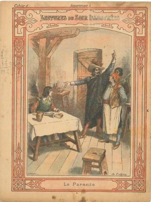 Couverture non numérotée : Le parasite. Chromolithographie sur papier épais beige. Frise élégante en 1ère et 4ème de couverture. Au dos, texte signé Lesage, écrivain mort ne 1747).