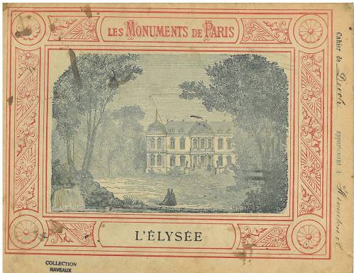Couverture non numérotée : L’Elysée. Chromolithographie sur papier épais. Bichromie et frise élégante, reprise au dos, avec texte anonyme explicatif… cahier de devoir appartenant à (illisible)