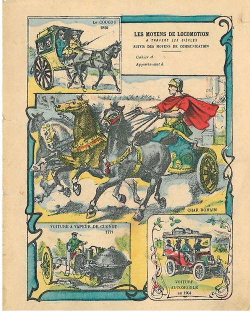 Cette série de 12 couvertures, numérotée et complète dans la collection, a comme titre complet Les moyens de locomotion à travers les âges, suivis des moyens de communication. C’est une très belle production de l’imagerie Vagné, à Pont-à-Mousson. Illustrateur inconnu.