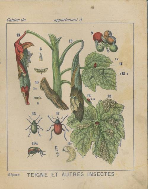 Couverture non numérotée : Teignes et autres insectes (planches avec numérotation°. Chromolithographie sur papier beige épais. Au dos, texte explicatif court et anonyme, avec renvoi à la gravure de la 1ère page.