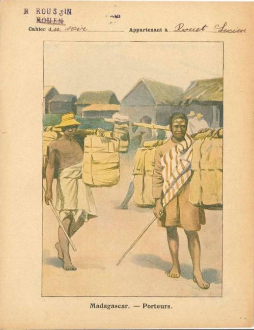 Couverture non numérotée : Porteurs. Chromolithographie sur papier épais beige… cahier du soir appartenant à Lucien (illisible). Au dos, texte explicatif anonyme.