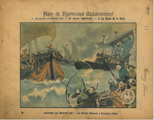 Couverture n° 7 : Navires du Moyen-âge / Les brûlots flamands à Ziricksée en 1304. Chromolithographie sur papier beige épais… cahier appartenant àHenri Carrez. En pages intérieures et au dos, texte signé Général H. de Sarrepont.