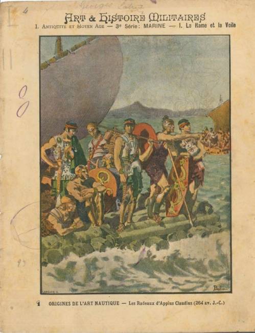 Cette série, au sous-titre La rame et la voile dans l’antiquité et le moyen-âge (troisième série), numérotée et incomplète dans la collection, fait partie d’une série plus large intitulée « Art et histoire militaires». C’est une des nombreuses productions des papeteries vosgiennes des Châtelles. Son directeur, Louis Geisler (1852-1014) reprend l’usine familiale de pâte à papier en 1881. Illustrateur, inventeur de la trichromophotogravure et d’une machine de fabrication de cahiers, il développe l’entreprise et ouvre une succursale à Paris. Il y crée un atelier de photographie et de phototypie qui attire les affichistes et les directeurs de presse….