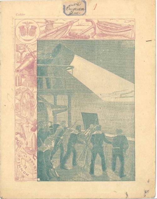 Couverture non numérotée : Les projecteurs électriques. Chromolithographie sur papier épais beige. Bichromie. Frise thématique élaborée (embarcation, ancre, drapeau…). Au dos, texte explicatif anonyme.