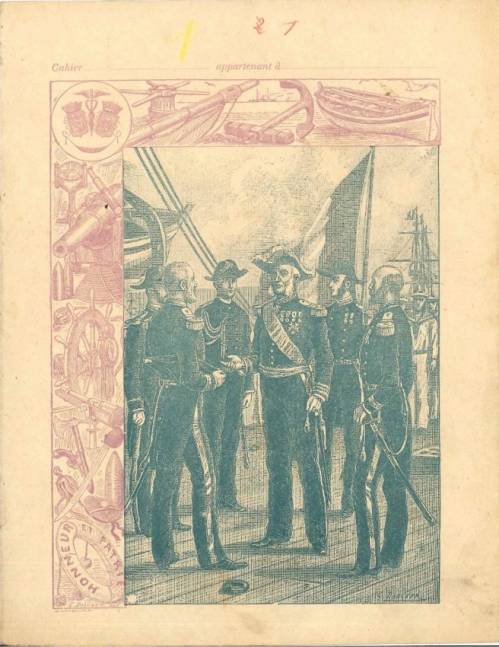 Couverture non numérotée : L’état-major. Chromolithographie sur papier épais beige. Bichromie. Frise thématique élaborée (embarcation, ancre, drapeau…). Au dos, texte explicatif anonyme.