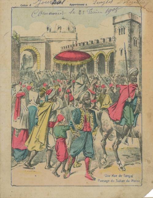 Couverture n°7 : La question marocaine. / Une rue de Tanger au passage du sultan. Chromolithographie sur papier épais beige… cahier-journal appartenant à Lenglet. Au dos, texte explicatif anonyme.