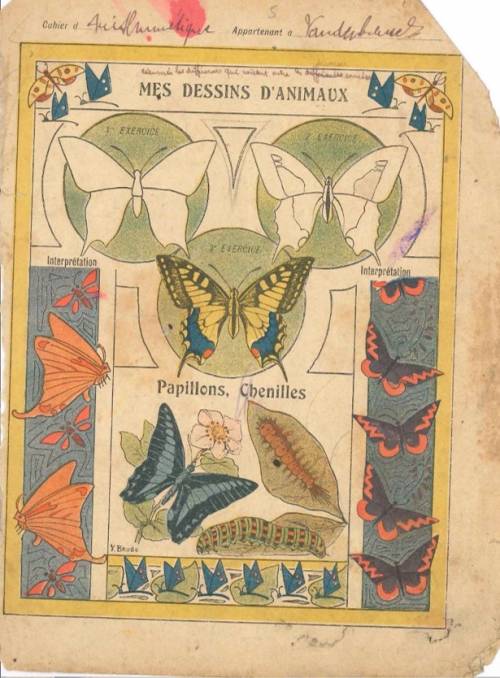 Couverture non numérotée : Papillons, chenilles. Chromolithographie sur papier épais beige. Plusieurs dessins et interprétations décoratives... cahier d’arithmétique appartenant à Vandenbeusch. Dos arraché.