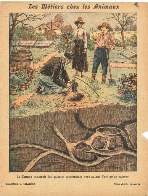 Couverture non numérotée : La taupe construit des galeries avec autant d’art qu’un mineur. Chromolithographie sur papier beige épais. Au dos, texte signé Er. Richa, anagramme de l’éditeur.