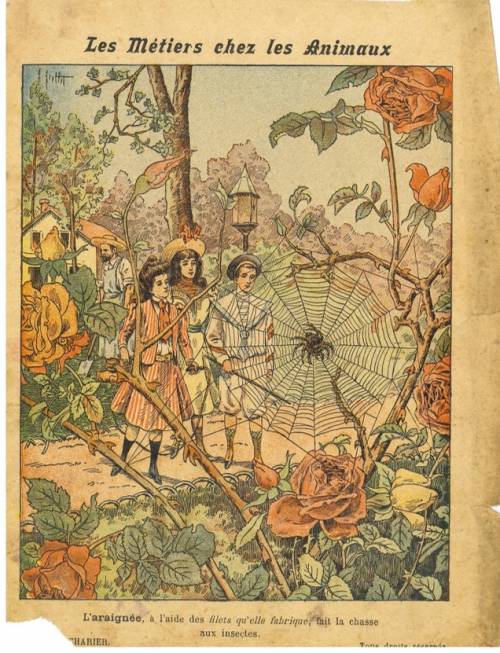 Couverture non numérotée : L’araignée, à l’aide des filets qu’elle fabrique, fait la chasse aux insectes.. Chromolithographie sur papier beige épais. Au dos, texte signé Er. Richa, anagramme de l’éditeur.