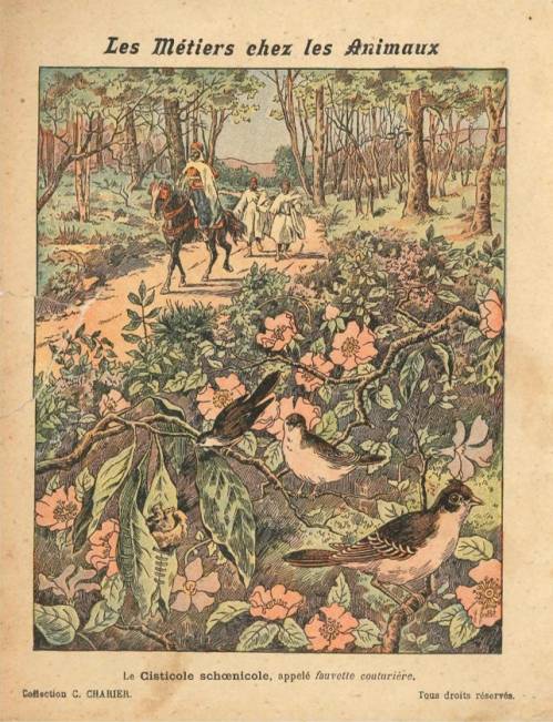 Couverture non numérotée : Le cisticole schoenicole, appelé fauvette couturière. Chromolithographie sur papier beige épais. Au dos, texte signé Er. Richa, anagramme de l’éditeur.