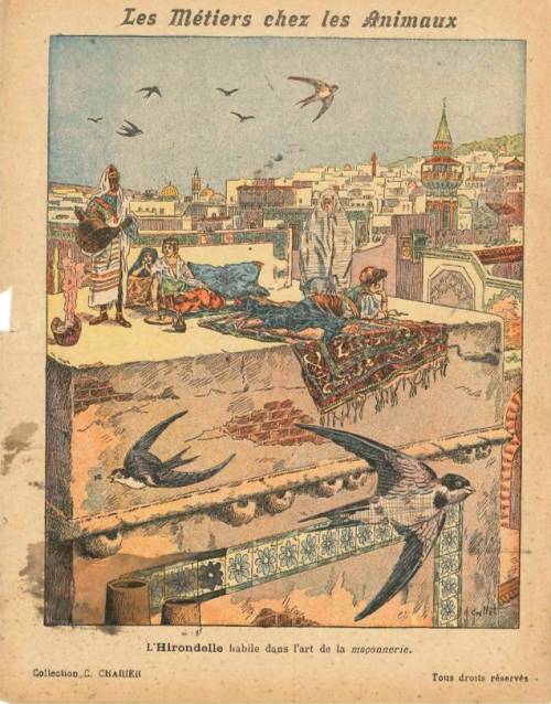 Couverture non numérotée : L’hirondelle, habile dans l’art de la maçonnerie. Chromolithographie sur papier beige épais. Au dos, texte signé Er. Richa, anagramme de l’éditeur.