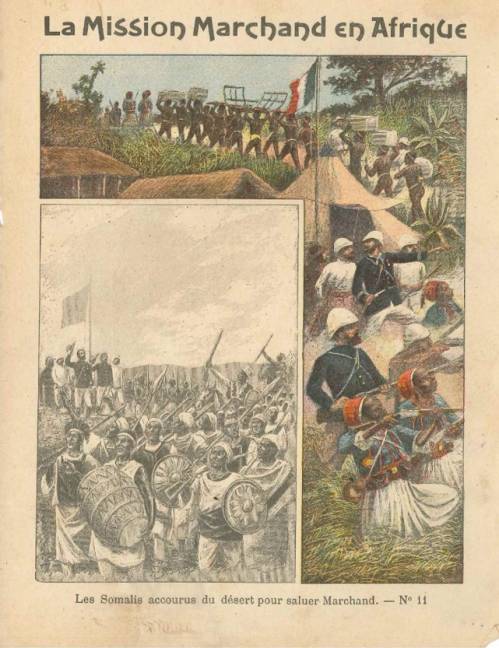 Couverture n°11: Les Somalis accourus du désert pour saluer Marchand. Chromolithographie sur papier épais beige. Gravure en n&b et importante frise sur des scènes militaires et en brousse. Au dos, texte explicatif signé Er. Richa, l’anagramme de l’éditeur.