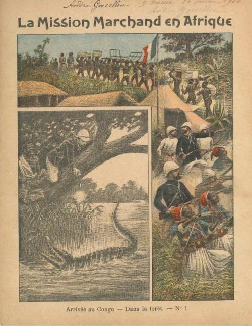 Couverture n°1 : Arrivée au Congo / Dans la forêt. Chromolithographie sur papier épais beige. Gravure en n&b et importante frise sur des scènes militaires et en brousse… cahier appartenant à André GosselIn. Au dos, texte explicatif signé Er. Richa, l’anagramme de l’éditeur.
