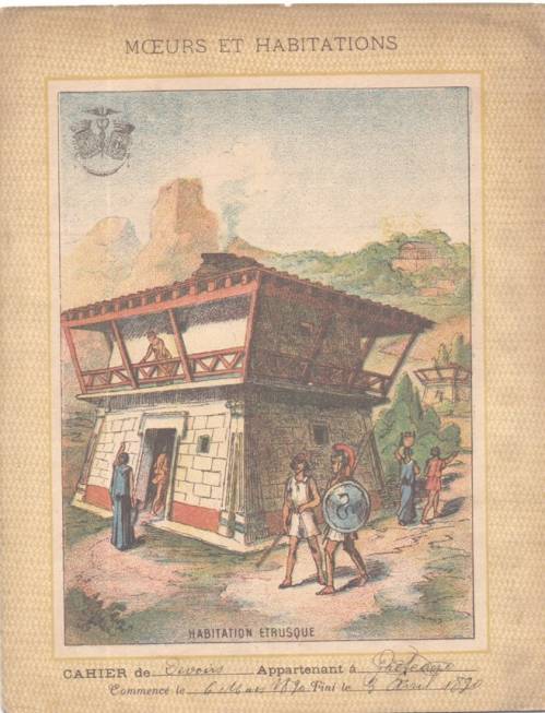 Couverture non numérotée : Habitation étrusque. Chromolithographie, gravure sur fond vert… cahier de devoir appartenant à (illisible), commencée le 6 mars 1890, fini le 5 avril 1890.. Au dos, texte explicatif signé Pascal Allain.