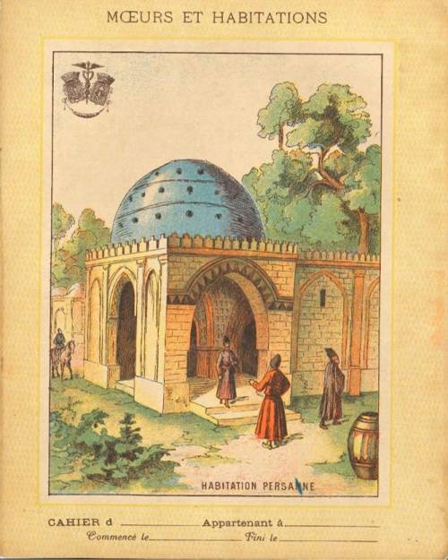 Couverture non numérotée : Habitation persane. Chromolithographie, gravure sur fond vert… cahier de devoir appartenant à (illisible). Au dos, texte explicatif signé Pascal Allain.