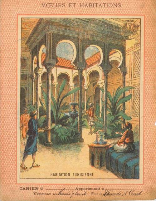 Couverture non numérotée : Habitation tunisienne. Chromolithographie, gravure sur fond vert. Au dos, texte explicatif signé Pascal Allain.