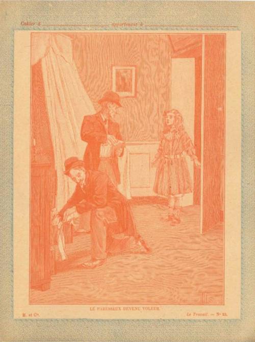 Couverture n° 23 : Le paresseux devient voleur. Chromolithographie sur papier épais beige. Bichromie. Au dos, texte explicatif anonyme.