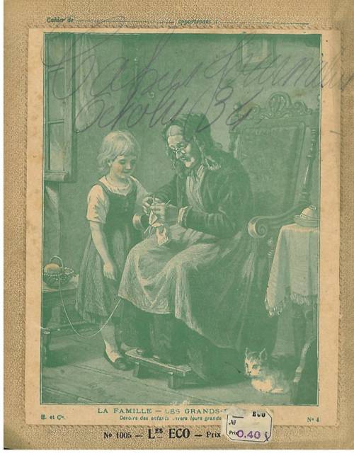 Couverture n° 4 : La famille / Les grands parents. Chromolithographie sur papier épais beige. Bichromie. Au dos, texte explicatif anonyme.