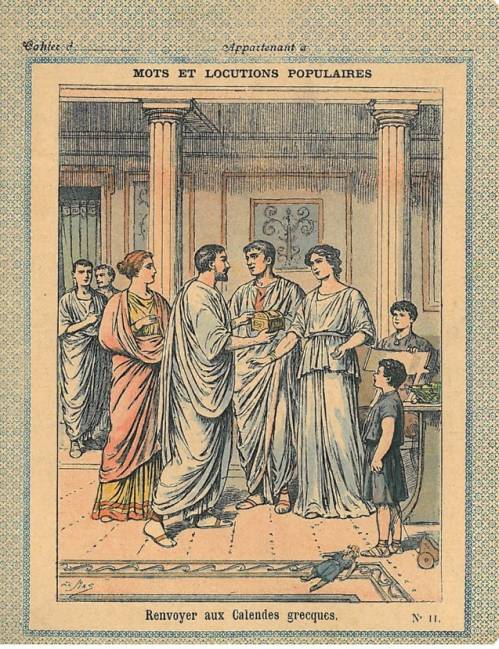 Couverture N° 11 : Renvoyer aux calendes grecques. Chromolithographie avec frise, sur papier épais chromo bleu…. Cahier de devoir appartenant à Léopold. Texte anonyme au dos : explication de l’origine de l’expression