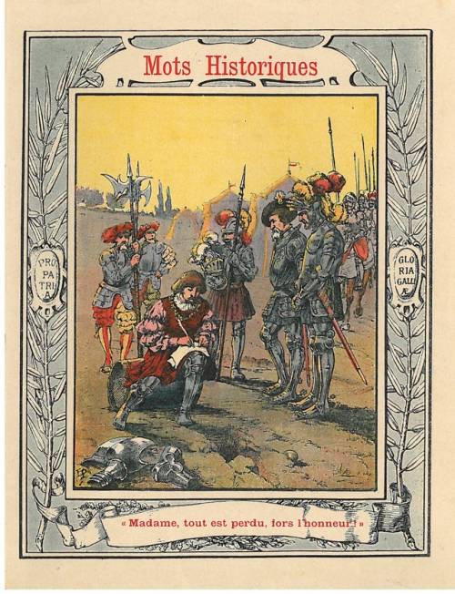 Couverture non numérotée : François 1er / « Madame, tout est perdu, sauf l’honneur. ». Frise élégante. Chromolithographie sur papier épais beige. Au dos, texte explicatif anonyme.