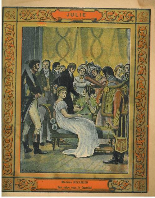 Couverture non numérotée : Madame Julie de Récamier (son salon sous le consulat). Chromolithographie sur papier beige épais. Encadrement rouge avec rehauts dorés. En pages intérieures et au dos, texte explicatif signé Valentine Deprez.