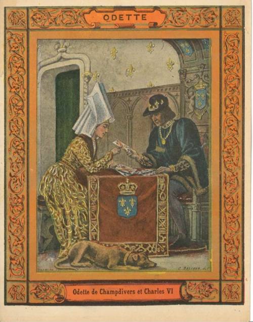 Couverture non numérotée : Odile de Champdivers et Charles VI. Chromolithographie sur papier beige épais. Encadrement rouge avec rehauts dorés. En pages intérieures et au dos, texte explicatif signé Valentine Desprez.