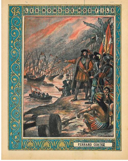 Couverture non numérotée : Fernand Cortez. Chromolithographie sur papier beige épais. Encadrement bleu avec rehauts dorés. En pages intérieures et au dos, texte explicatif signé Daniel Lépine.
