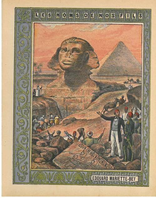 Couverture non numérotée : Edouard Mariette-Bey. Chromolithographie sur papier beige épais. Encadrement bleu avec rehauts dorés. En pages intérieures et au dos, texte explicatif signé Daniel Lépine.