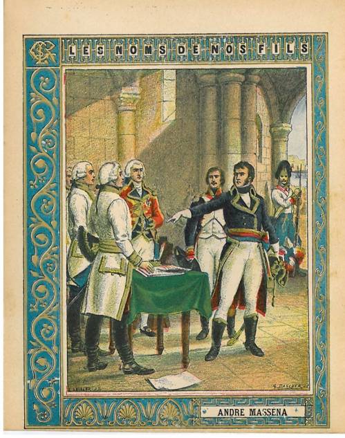 Couverture non numérotée : André Masséna. Chromolithographie sur papier beige épais. Encadrement bleu avec rehauts dorés. En pages intérieures et au dos, texte explicatif signé Daniel Lépine.