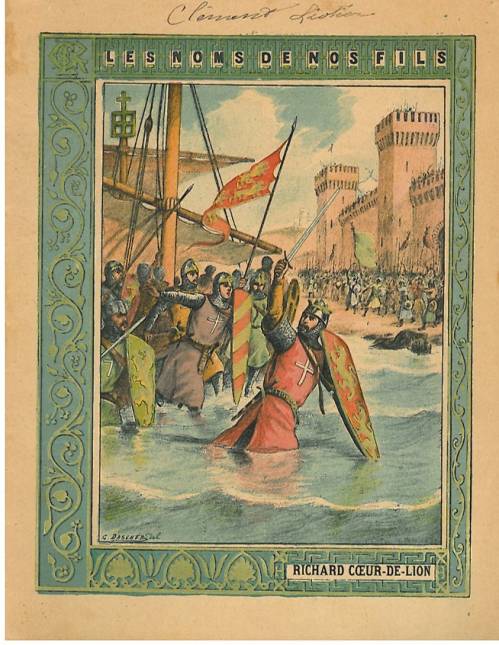 Couverture non numérotée : Richard Cœur de Lion. Chromolithographie sur papier beige épais. Encadrement bleu avec rehauts dorés. En pages intérieures et au dos, texte explicatif signé Daniel Lépine.