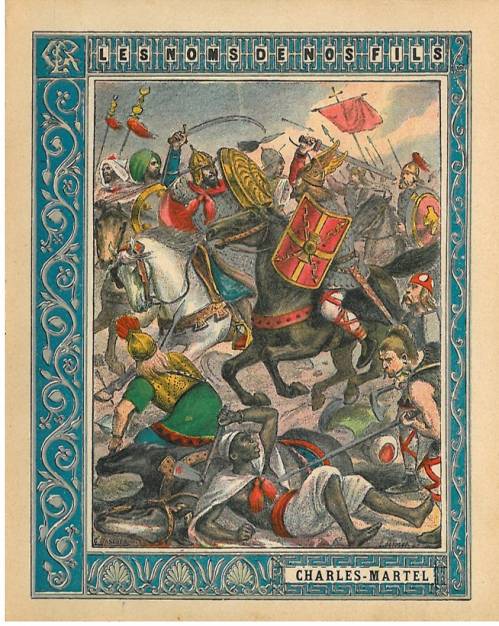 Couverture non numérotée : Charles Martel. Chromolithographie sur papier beige épais. Encadrement bleu avec rehauts dorés. En pages intérieures et au dos, texte explicatif signé Daniel Lépine.