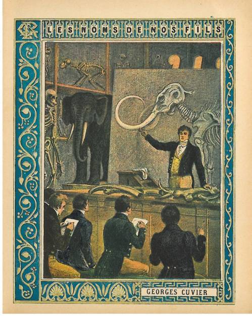 Couverture non numérotée : Georges Cuvier. Chromolithographie sur papier beige épais. Encadrement bleu avec rehauts dorés. En pages intérieures et au dos, texte explicatif signé Daniel Lépine.