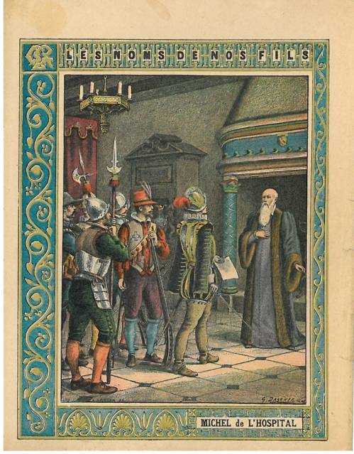Couverture non numérotée : Michel de l’Hospital. Chromolithographie sur papier beige épais. Encadrement bleu avec rehauts dorés. En pages intérieures et au dos, texte explicatif signé Daniel Lépine.