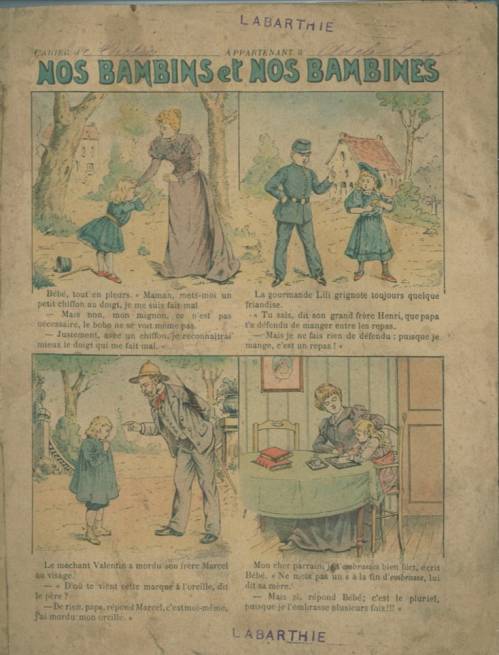 Couverture non numérotée : 4 saynètes-blagues. Chromolithographie sur papier épais beige… cahier de racines grecques appartenant à Georges Legrand. Au dos, extrait des Cahiers de dessin, Cours préparatoire, de Chopin.