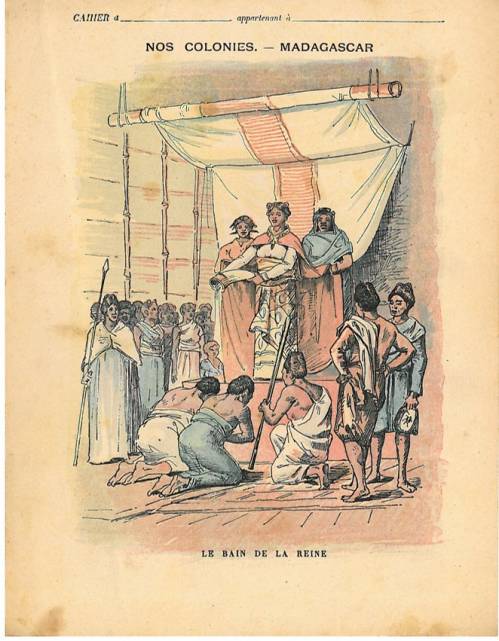 Couverture non numérotée : Le bain de la reine. Chromolithographie sur papier épais. En 3ème de couverture, texte explicatif. Au dos, gravure en n&b : armes et tambours.