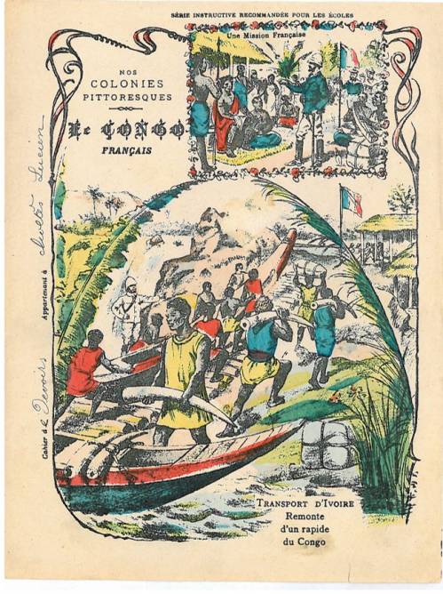 Couverture n° 6: Le Congo français. Chromolithographie sur papier épais beige. Plusieurs saynètes et frise florale… cahier de devoirs appartenant à Lucien Cholter. Au dos, texte explicatif anonyme.