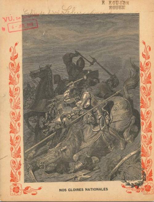 Couverture non numérotée : Gaston de Foix à Ravenne. Chromolithographie sur papier épais beige. Gravure en n/b et frise rouge. Au dos, texte explicatif anonyme.