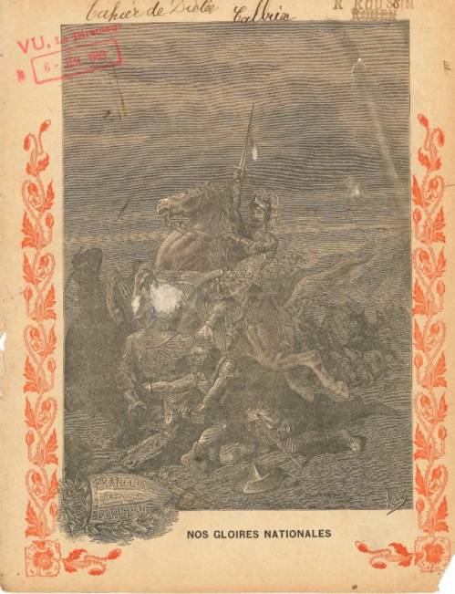 Couverture non numérotée : François 1er à Marignan. Chromolithographie sur papier épais beige. Gravure en n/b et frise rouge. Au dos, texte explicatif anonyme.