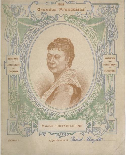 Couverture non numérotée : Madame Furtado-Heine, philanthrope. Portrait-médaillon dans frise décorée. Chromolithographie sur papier épais beige… cahier appartenant à Rachel Chanzotte. Au dos, texte explicatif anonyme.