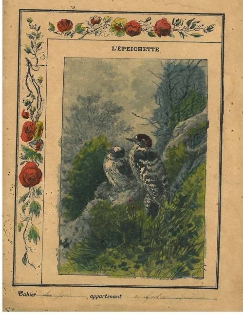 Couverture non numérotée : Les épeichettes Chromolithographie sur papier beige épais. Frise florale et gravure en n/b, avec encart (Nos oiseaux, par André Theuriet, illustration de Giacomelli). Au dos, le poème annoncé en 1ère de couv.