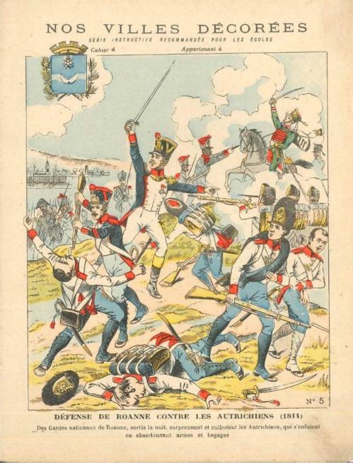 Couverture n°5 : Défense de Roanne contre les Autrichiens en 1814. Chromolithographie sur papier épais beige. Au dos, texte explicatif anonyme.