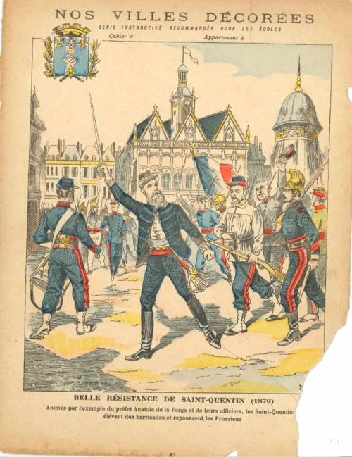 Couverture n°8 : Belle résistance de Saint-Quentin (1870). Chromolithographie sur papier épais beige. Au dos, texte explicatif anonyme.