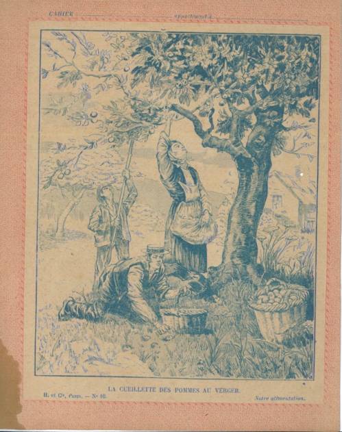 Couverture n°10 Cueillette des pommes au verger. Chromolithographie sur papier épais beige. Bichromie. Au dos, texte explicatif anonyme