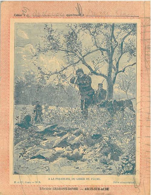 Couverture n°8 : A la poursuite du gibier à pied. Chromolithographie sur papier épais beige… cahier de devoir appartenant à (illisible) Bichromie. Au dos, texte explicatif anonyme.
