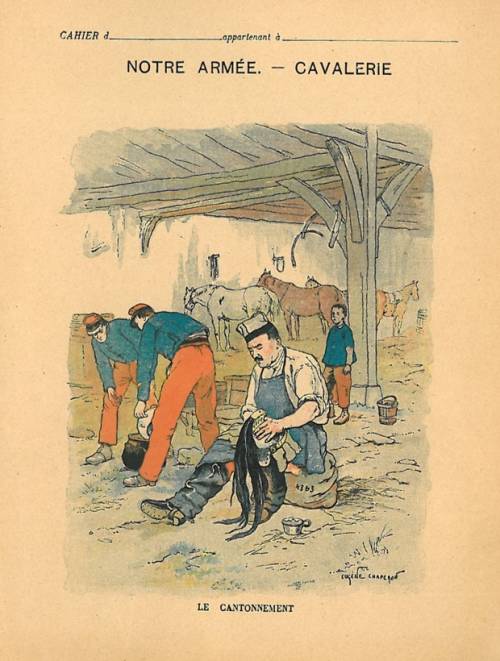 Les illustrations sont d’Eugène Chaperon (1857-1938), diplômé des Beaux-arts de Paris, illustrateur de presse. Il est surtout connu pour ses illustrations sur la cavalerie militaire,- il travaille pour le ministère de la Guerre à partir de 1920 -, et participe régulièrement aux Cahiers d’enseignement illustrés, collections sur les uniformes militaires.
