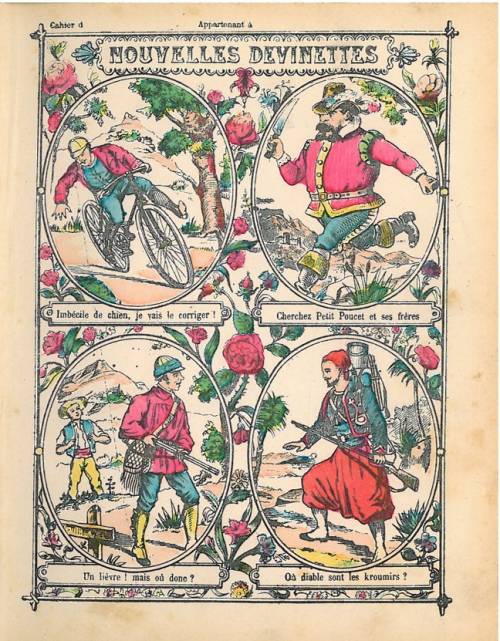 Cette importante série, dont chaque couverture présente 4 saynètes dans lesquelles il faut trouver un objet, un personnage ou un animal, est numérotée et incomplète dans la collection. C’est une des très nombreuses productions des papeteries vosgiennes de Clairefontaine. En 1858, Jean-Baptiste Bichelberger reprend un moulin à papiers (à base de chiffon) créé au 16ème siècle et le modernise. Vingt ans plus tard, son fils et son gendre, Campion, y introduisent le bois comme matière première et se lancent dans la fabrication d’enveloppes et de cahiers. De 1904 à 1914, l’entreprise (1000 employés) est dirigée par Louis Nusse et Étienne Bodet… Illustrateur inconnu.